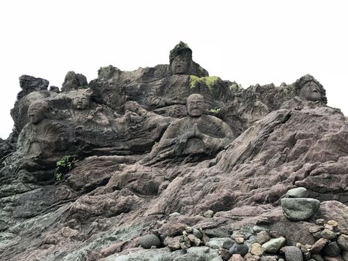 山形の旅。順番に参ります。 まずは『十六羅漢岩』晴れた日に見たかったー(笑) 朝6時に道の駅を出発しすぐ到着。雨は止まず、傘をさして海岸沿いへ。 食堂・駐車場・トイレ完備されています。早朝散歩のおじさんが一人だけいました。 国定公園なんですね!と…